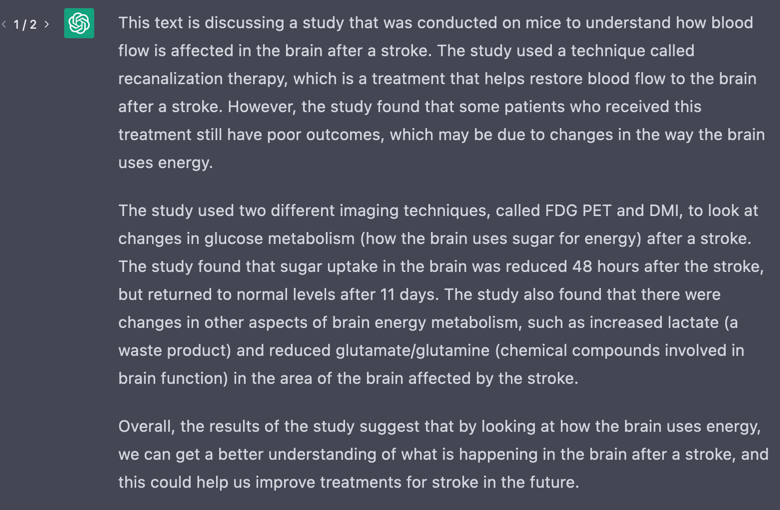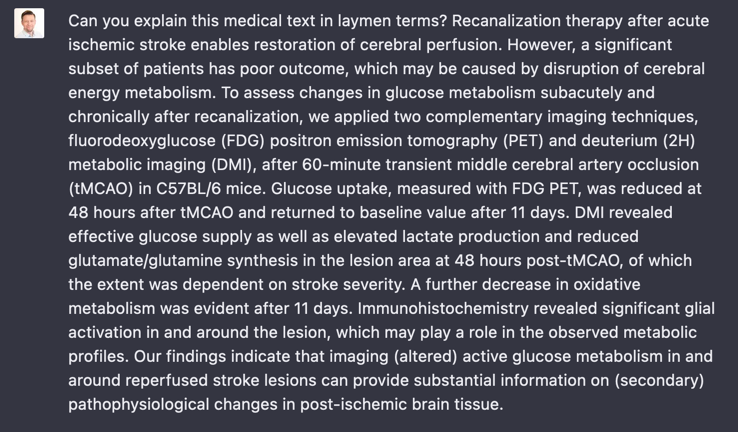 Recanalization therapy, glucose uptake, post-TMCAO. Pää pehmenee kun tätä yrittää tulkita. Onneksi voin itse tehdä hommia IT-alalla, superhelppoa verrattuna tällaisiin teksteihin. Mitä ChatGPT sitten vastasi?
